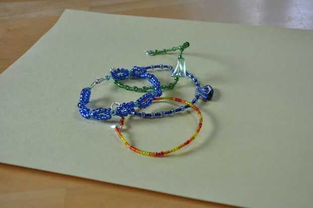Hacer satén precioso o joya tono cuentas de antiguos vasos de plástico, botellas de refresco de plástico y jarras de leche - apenas sobre cualquier cosa fina suficiente para corte y plegado de la curva. Combiné los granos plásticos que hice con vidri