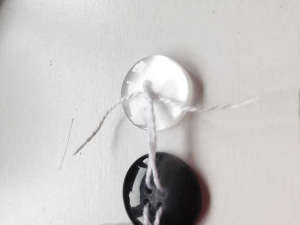 Atar los cabos sueltos del hilo con un nudo (nudo de la abuelita) y pulgar alrededor del botón, luego cortar los extremos y evitar que se deshilache por untar con algún esmalte de uñas claro. Dejar secar.