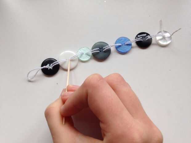 Utilizando su esmalte de uñas transparente o pegamento y un palillo, dab la parte inferior del botón para fijar el botón en el hilo. Repita con cada botón hasta llegar al final. Dejar secar.