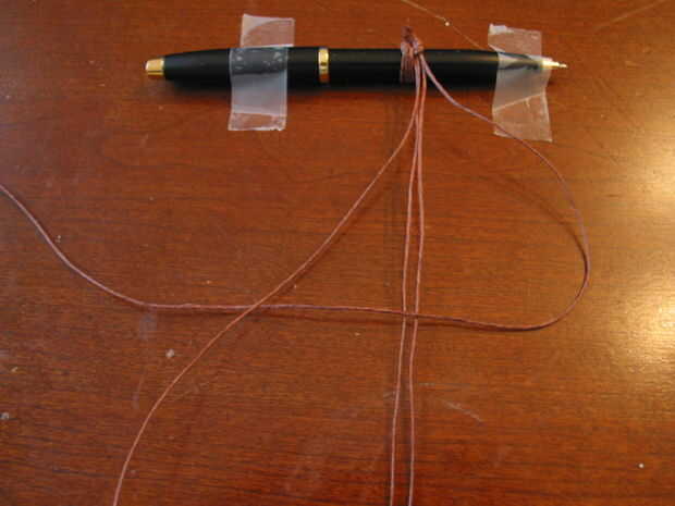 -Tomar la hebra izquierda y páselo por debajo de los hilos del mediados y a través del agujero en el '4'.