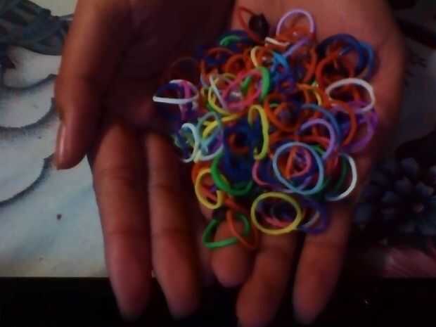 se necesita un telar o puede usar dos dedos (opcionales)un clip de s o un clip de cY un gancho dePaso 1: Agregue una banda Añadir una banda y un signo de infinitoPaso 2: Añadir dos bandas más (como se muestra)Paso 3: Vas a agarrar la banda inferior y