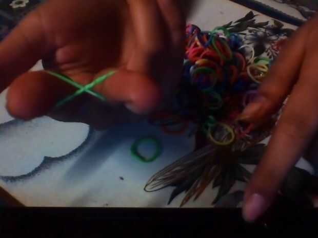 Primero apagado utilizando 1 banda de telar, use 2 "paz dedos" a través de él para hacer un signo de infinito.