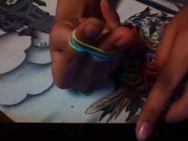se necesita un telar o puede usar dos dedos (opcionales)un clip de s o un clip de cY un gancho dePaso 1: Agregue una banda Añadir una banda y un signo de infinitoPaso 2: Añadir dos bandas más (como se muestra)Paso 3: Vas a agarrar la banda inferior y
