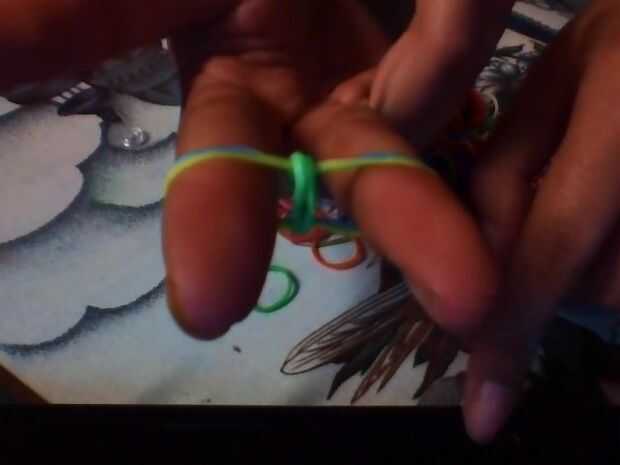 se necesita un telar o puede usar dos dedos (opcionales)un clip de s o un clip de cY un gancho dePaso 1: Agregue una banda Añadir una banda y un signo de infinitoPaso 2: Añadir dos bandas más (como se muestra)Paso 3: Vas a agarrar la banda inferior y