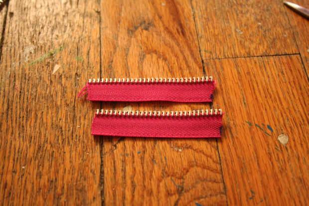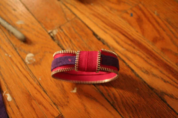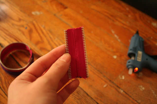 Ahora, para hacer el cierre, cortar dos tiras de 2-1/2" de cremallera y fije los lados juntos para que los dientes estén en el exterior. Luego, envuélvala alrededor del extremo de la pulsera, donde último pega los extremos. Se trata de la hebilla y la base donde vas a colocar tu flor.