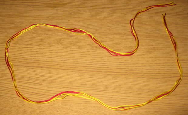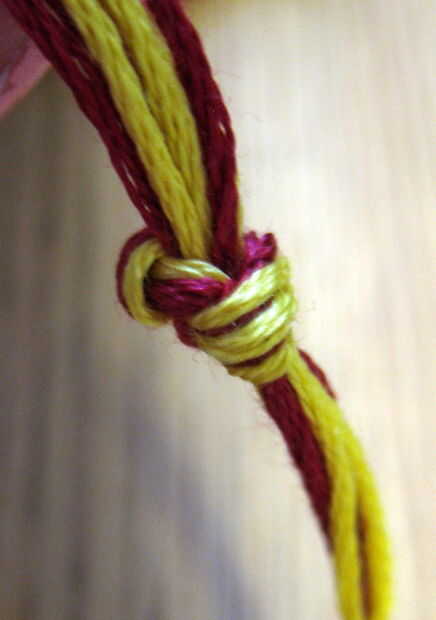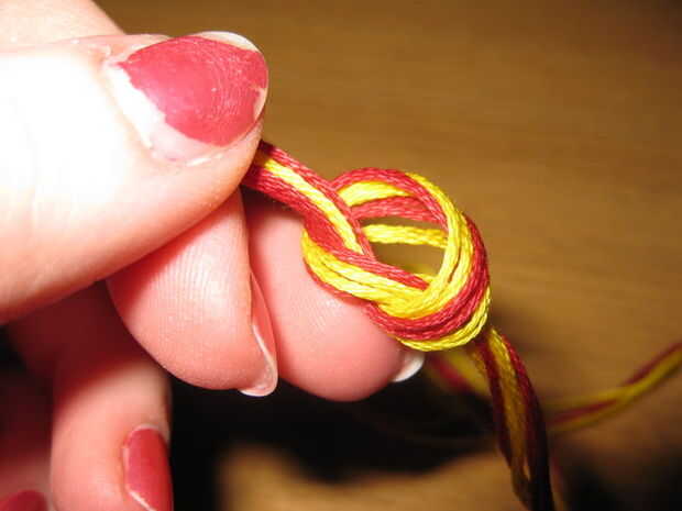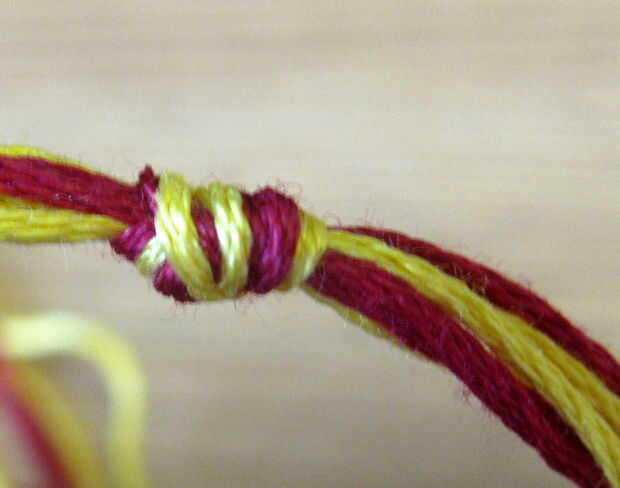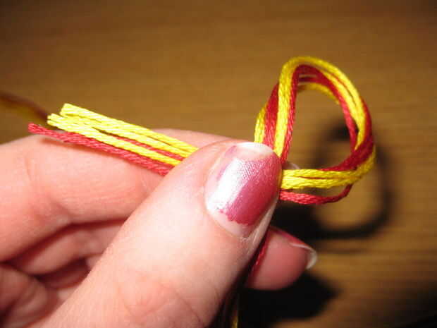 2. Ponga todos sus filamentos de seda del bordado juntos, lado a lado y un doble nudo en un extremo de la reunión de los filamentos.