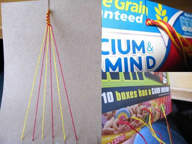 3. Coloque el nudo en la ranura superior de la pieza de cartón de caja de cereal. Tire de los hilos firmemente a través de la ranura para que el nudo quede a ras con la parte posterior de la cartulina.