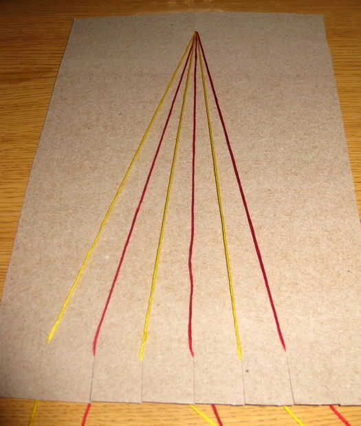 4. al separar las hebras de seda del bordado y alternando los colores, colocar cada hilo en una ranura individual en la parte inferior del tablero de tarjeta. Tire los filamentos firmemente a través de las ranuras para que no le dé ninguna holgura.