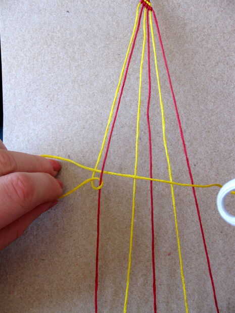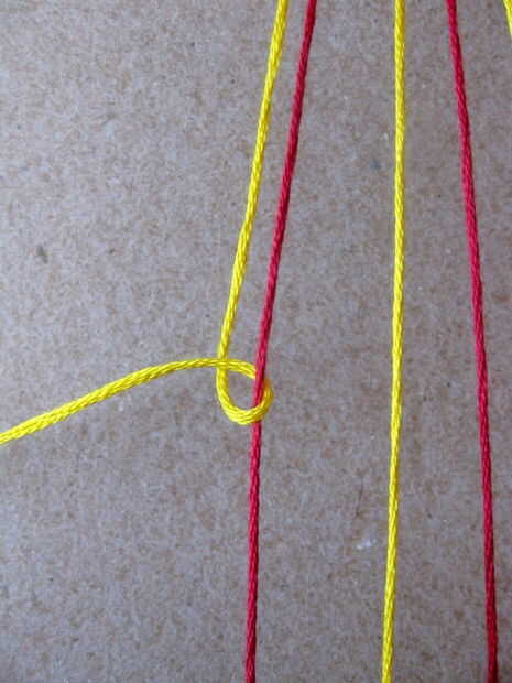 -La primera cadena que esté trabajando de debajo de la segunda cadena del gancho agarrador.  Tire de la cola de la primera cadena completamente a través de y hacia la izquierda.  Ahora debe tener la primera cadena colocar alrededor de la segunda cadena en la ranura original.