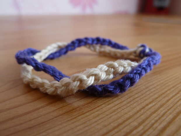 Esta pulsera consiste en tres círculos que han sido ganchillo juntos. Utiliza el mismo principio utilizado para tejer de mobius, pero normalmente siete anillos se unen de esta manera tejiendo unos en los otros una vez. Para esta pulsera, tejió los cí