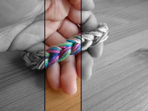 Para el final he utilizado una teqnique ligeramente diferente. En primer lugar, quité la primera parte del nudo del resbalón para dar a la pulsera un final más. Entonces, hizo el circuito más grande y poner el hilo a través de, uno por uno por supuesto :)