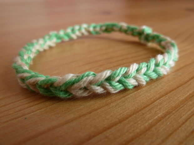 Esta pulsera consiste en tres círculos que han sido ganchillo juntos. Utiliza el mismo principio utilizado para tejer de mobius, pero normalmente siete anillos se unen de esta manera tejiendo unos en los otros una vez. Para esta pulsera, tejió los cí