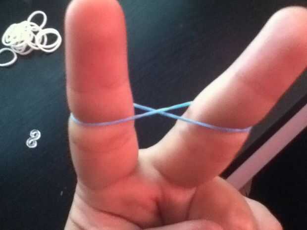 Obtener primero su primera banda de goma para hacer un infinito muestra Pon tu dedo a través de cada orificio de la torcedura Luego añadir dos bandas más (¡ no tuerza éstos)