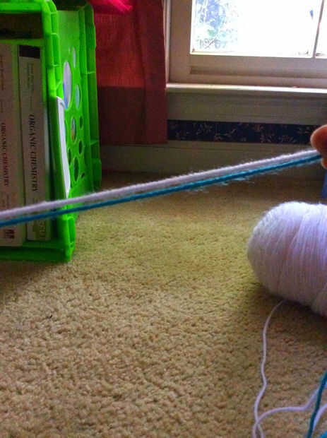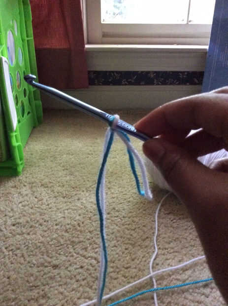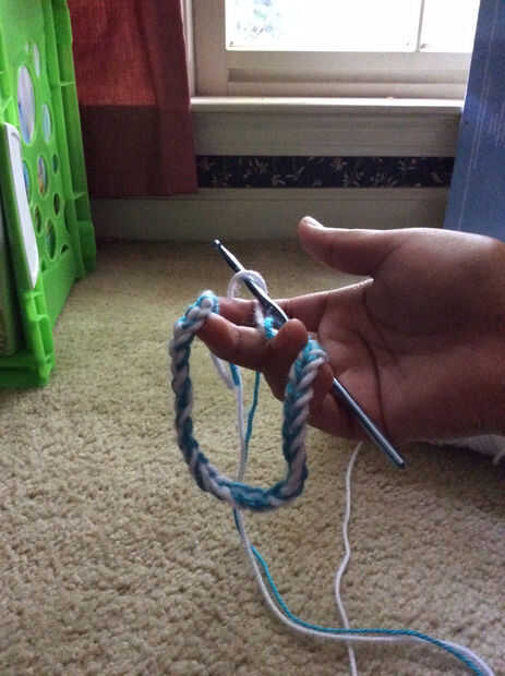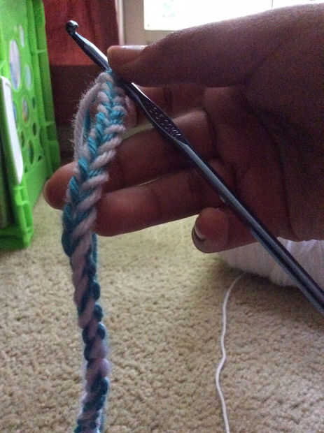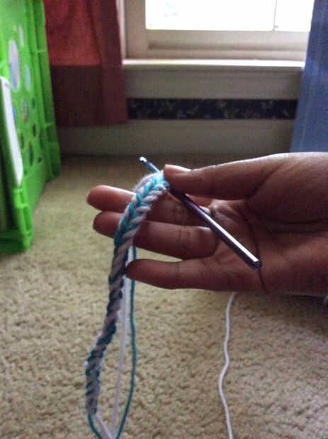 Comienzo sosteniendo ambos soportes de hilo para hacer un nudo del resbalón. Luego, envuelva el hilo alrededor del gancho y tirón lanzó el lazo. Ahora, usted tiene una cadena! Seguir haciendo suficientes cadenas para circundar su riesgo. Encadenaron 25 veces y luego, puntada de resbalón.