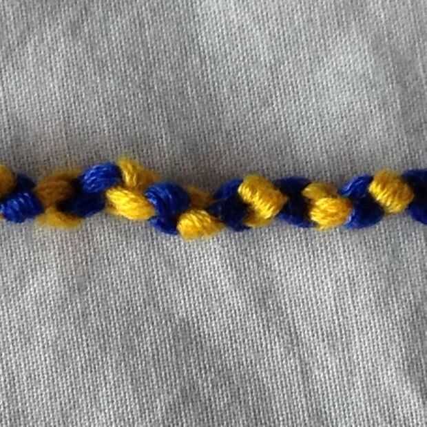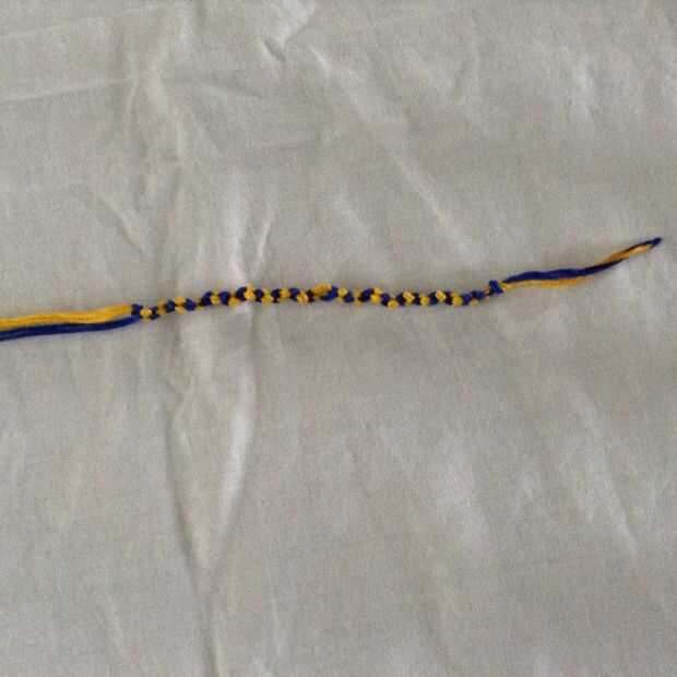 una pulsera bastante sencillo que sólo requiere 1 nudo. Utilicé 4 colores (1 azul, rojo 2, naranja 3, amarillo 4) pero se puede elegir en cualquier lugar entre 3-8 colores.Materiales que necesitas:-Cadena (a veces llamada seda en tiendas de artesaní