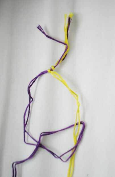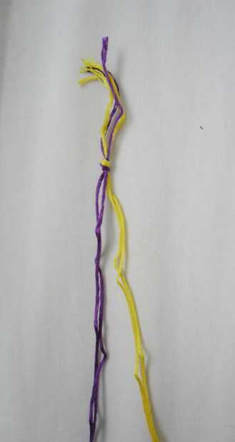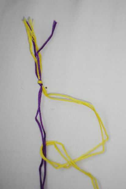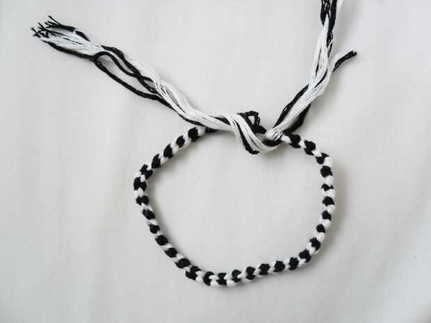 Para hacer la Pulsera anudada, se necesitan 4 trozos de lana / cuerdas cerca de 70cm (27 pulgadas) largo, 2 de un color y 2 de otro. Atar los pedazos de cuerda juntos en un nudo 4-5 cm (2 pulgadas) de la parte superior. Separe las cuerdas en los colores como se muestra en la imagen. Tomar un color y atar un saber alrededor de la otra. Tire firmemente. Ahora toma otro color y atarla con un nudo en el primer color. Tire firmemente. Repita por atar nudos de colores alternos hasta que estás 4-5 cm (2 pulgadas) del extremo. Ate de aquí.