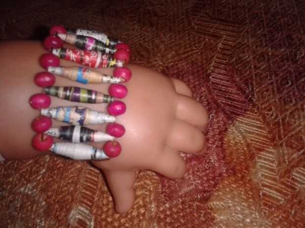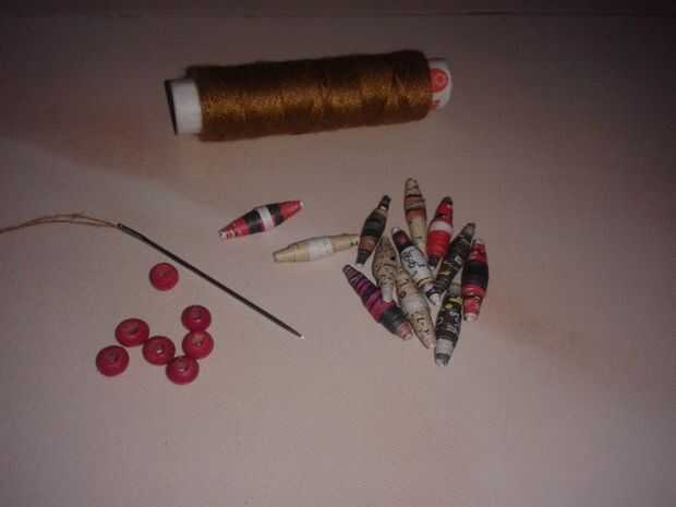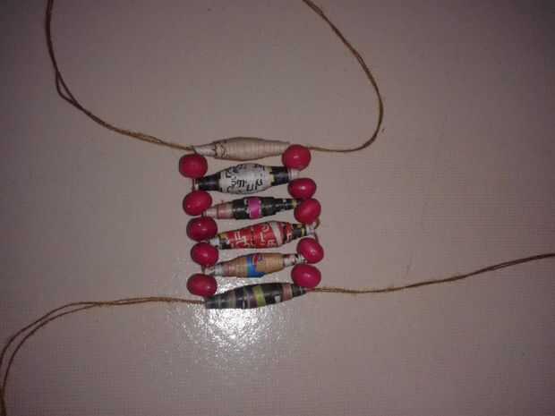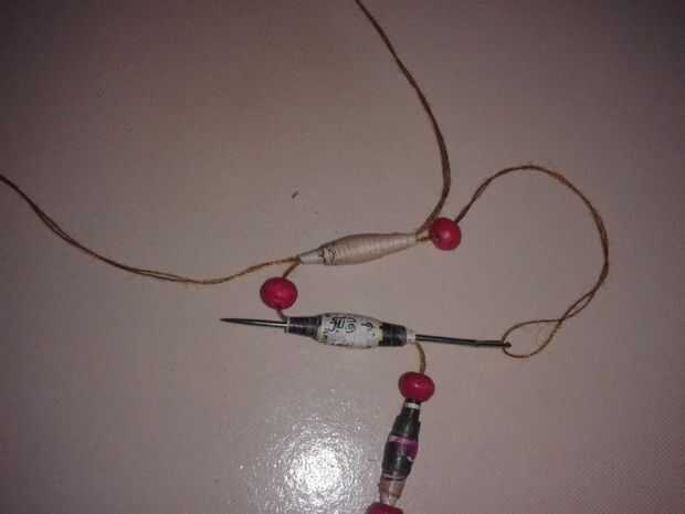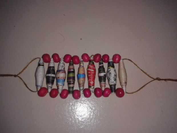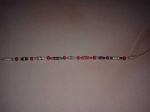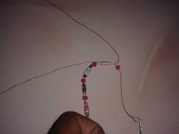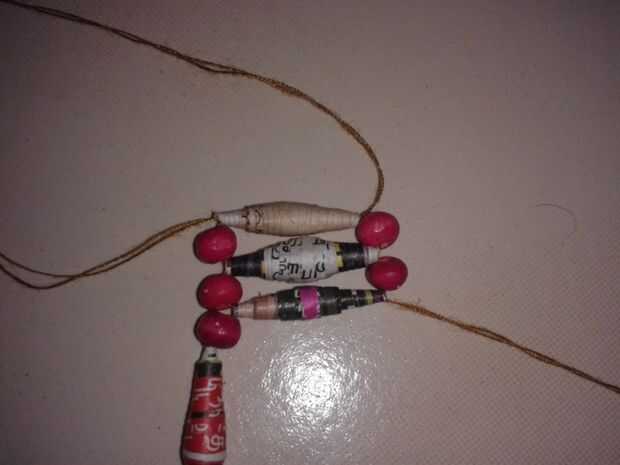 3) puesta en marcha con la fabricación de un diseño sencillo, para hacerlo más atractivo también agrego madera redondo granos entre cada cuentas de papel.