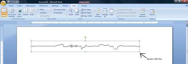 Pegar esto en Microsoft Word. A continuación, recortar la imagen para que sólo pueda ver la onda de sonido. Ahora, usted puede cambiar el color del fondo y de la onda de sonido sí mismo. Por último, cambiar el tamaño de la imagen por lo que es la misma longitud que el diámetro de la muñeca de la persona que usted está haciendo para. Al cambiar el tamaño, asegúrese de que arrastra el botón de la esquina, o de lo contrario se distorsionará la imagen.