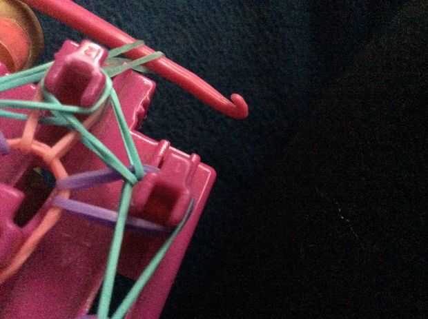 Ponga el gancho a través de la última clavija donde están todas las bandas pero no a través de la banda que capsula. Poner una banda que gancho y mantenga uno lado de la banda y con su gancho vas a tirar con cuidado a través de la banda y la ponga el otro extremo en el gancho y tirar tu pulsera de telar. Asegúrese de que tener todas las bandas en una banda. Para que las flechas están mirando hacia fuera y coloque vendas abajo un extremo del tirón su telar. Después la banda que está en el gancho en el extremo y empezar a telar.