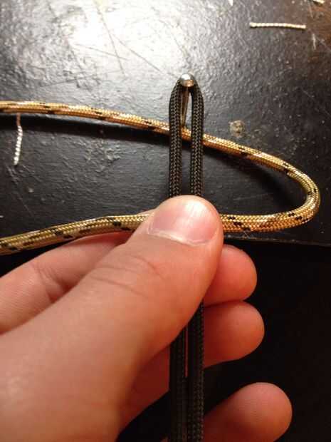 realmente no hay una explicación, sólo una pulsera paracord con 2 tipos de paracord. que yo sepa, soy el primero en pensar en esto.Paso 1: doblar el paracord y colócala en el orificio y los otros dos hilos, es muy difícil de explicar - así que lo sie