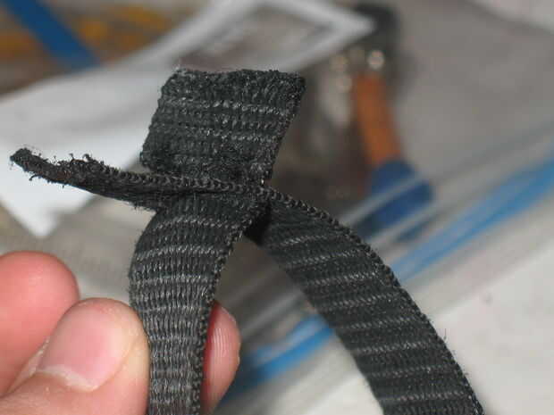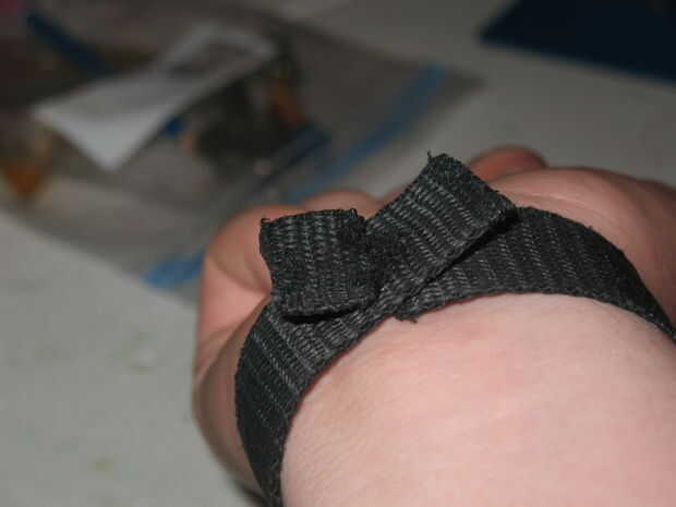 -Envuélvalo alrededor de su muñeca (con los extremos en la parte superior) y trate de forzar la esquina del extremo A en el orificio en el extremo B. Una vez que hayas conseguido la esquina a través de, intentar tirar esa aleta entera a través de él. Si no funciona muy bien, puede ampliar el orificio.
