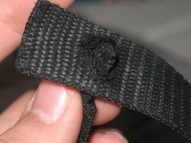 -Más probable es que la correa va a tener gran cantidad de fibras que se pega hacia fuera después de que la corte. El encendedor es muy útil aquí. Toma un encendedor y a derretir todas las fibras sueltas que se pueden encontrar. Ello alrededor del agujero, la ficha, todo. Una vez que estás satisfecho y la correa no tiene ninguna fibras más sueltas, puede continuar al siguiente paso. (si no quieres pintar un diseño en el suyo, vaya al paso 7)