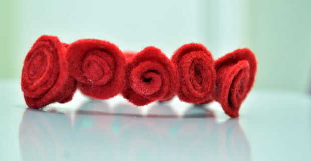 ¡ qué placer es llevar una joyería costosa o llevar tu propia joyería hecha a mano! Cuando estoy en hecho a mano, tiene que ser más barato que lo que puedo conseguir equivalente en el mercado. Por lo tanto, la clave es obtener materiales de bajo costo o gratis. Aquí hago una pulsera rosa roja de fieltro y lazos de torcedura... (sí... Escuchaste bien... Lazos de torcedura... o lazos del pan). ¿El costo? 27 centavos de dólar para el fieltro, que en medio de este proyecto. Y lazos... eran libres! He encontrado un montón en la sección de abarrotes Payless en un color verde hierba con mi compra de comestibles. Esto es de hecho una pulseras de 27 centavos... lo creas o no!