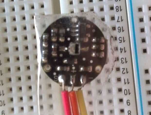También usé alguna cinta de embalaje transparente para sellar el sensor del pulso (se muestra en las fotos). La Página Web PulseSensor.com recomienda sellar la parte posterior y que cubre la parte delantera para proteger de suciedad y humedad. También, sellado de la parte posterior evita malas lecturas al sostener el sensor entre los dedos. De lo contrario, contacto con la piel en el circuito expuesto podría causar malas lecturas. Leí una revisión de cliente de este producto en Amazon donde el cliente se quejó de ser dado una sacudida eléctrica! Declararon el cableado estaba claro por cable mal y recibió una descarga. No he tenido esos problemas. El módulo parecía claramente marcado y funciona muy bien!