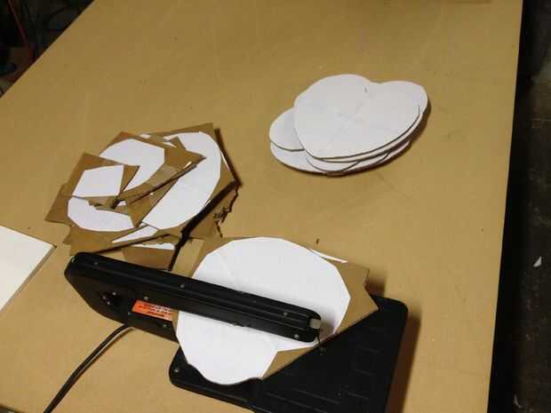 Yo simplemente tenía que cortar (otra vez) y la pila. Comenzó con un cuchillo x-acto, pero cambiado a una sierra de calar muy rápidamente. No era mucho más rápido, pero era mucho más fácil en mis manos! Utiliza el x-acto para cortar trozos de tamaños razonable y luego la Sierra de calar para hacer cada pieza.