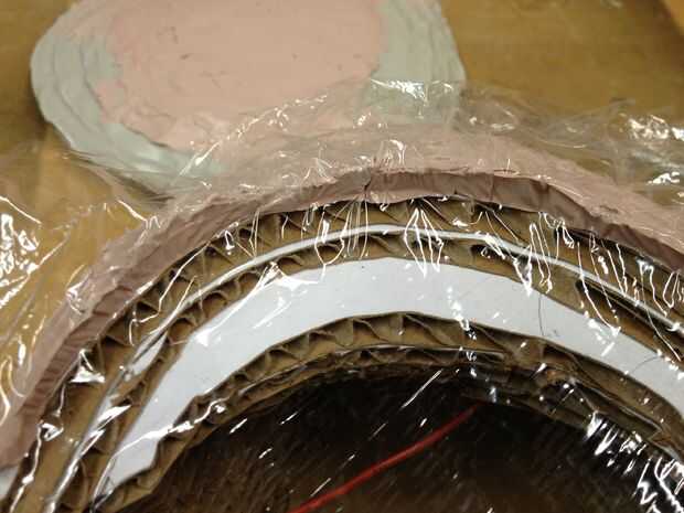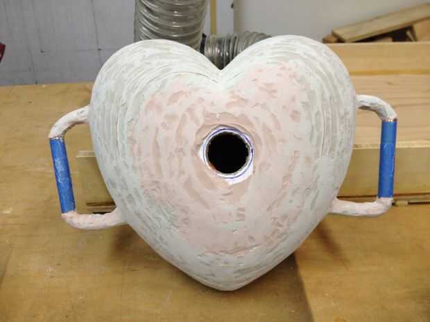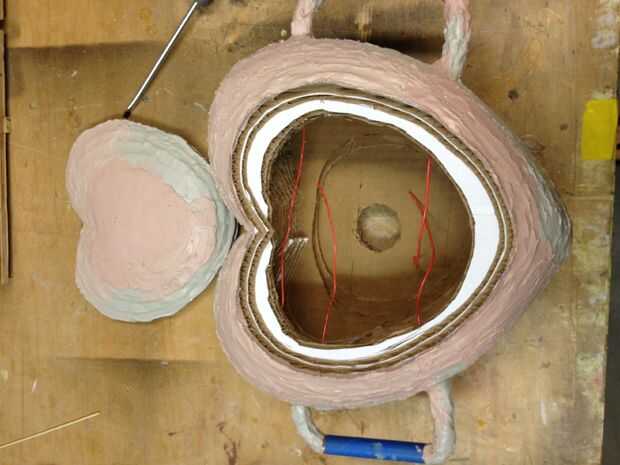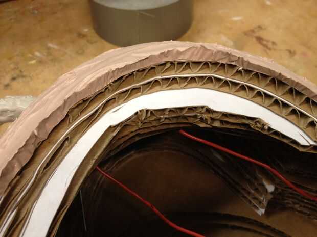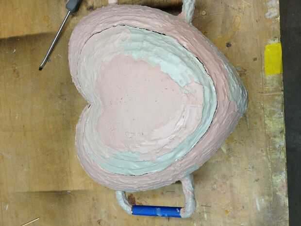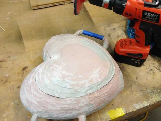 Una vez que tenga todo cubierto de masilla curada, pulir las asperezas. Necesitarás hacer al menos una y probablemente dos o tres, relleno rondas para traer para arriba las áreas bajas que se descubre después de lijar. Utilice una herramienta eléctrica si es posible. Usé un taladro con almohadillas de lijar y una dremel para las áreas pequeñas-curva de las manijas. Una vez todo áspera lija, hacer unas rondas de grano más fino y más fino. Bondo puede ser húmeda arenado, que es bonito como reduce al mínimo el polvo, pero ya que estaba trabajando con una base de cartón que decidí no agua de riesgo. Use una máscara antipolvo o un respirador! En el pix, verá que el bondo en el cuerpo de corazón ha sufrido una ronda de lijado basto antes el altavoz y el trabajo de borde de tapa.