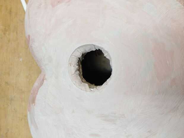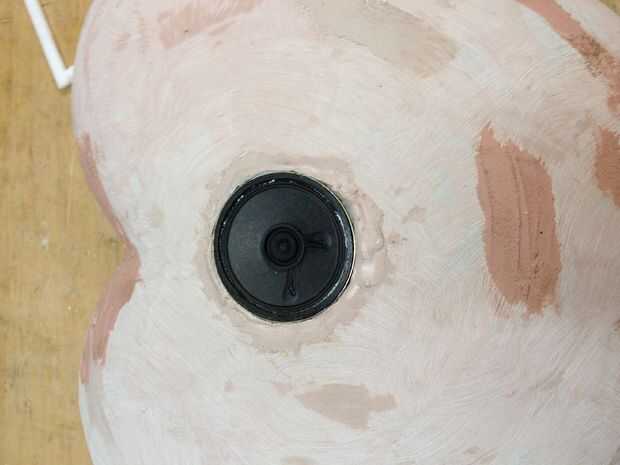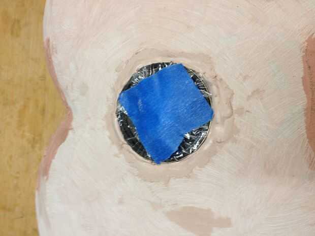 Para el agujero del altavoz, necesitaba los bordes de bondo para alinear suavemente con el altavoz, sin conseguir bondo en el altavoz. Envuelto y con cinta el altavoz con envoltura de plástico, había abofeteado algunos bondo húmedo alrededor de los bordes del agujero y pulsa el altavoz, empujando el bondo mojado por lo que cabe precisamente, y luego manteniéndolo hasta que curó.