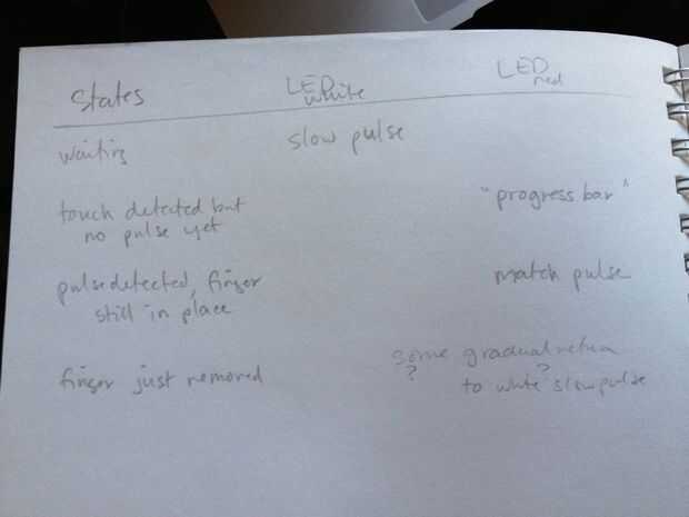 Puesto que el circuito interno necesita un poco de tiempo para sentir el pulso del usuario suficientemente, también decidimos que los LEDs incrustados se comportan diferente dependiendo del estado del dispositivo fue en: a la espera de un usuario, detección de un pulso o pulso música.