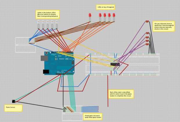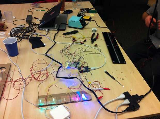 Para otra nota, todos nuestros dispositivos son hard-wired. En el futuro, sería bueno integrar algunas conexiones inalámbricas en el lápiz y peine, pero para este prototipo hemos intentado mantenerlo más simple. Una cosa útil que descubrimos es que en vez de intentar enviar 10 cables diferentes funcionando en paralelo de la placa, hasta el techo y en el lápiz y peine y tener que encontrar la manera de hacer un seguimiento de estos cables nosotros mismos, llegamos a la idea de hackear conexiones ethernet.