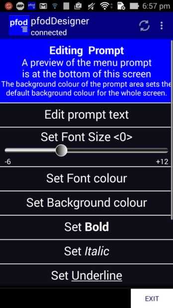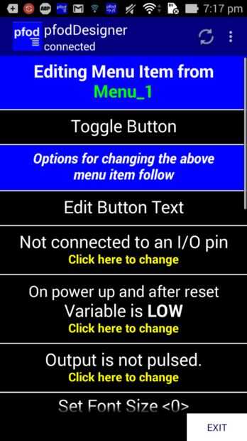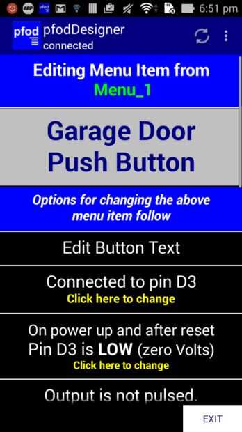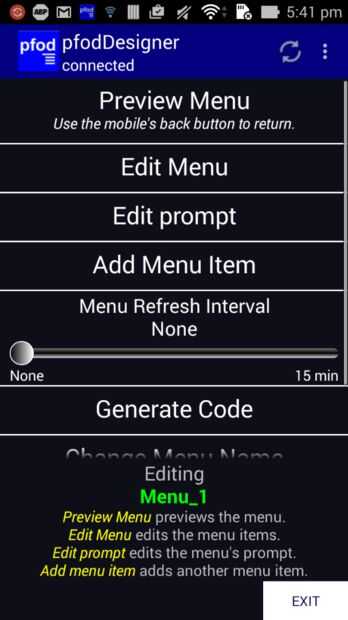Regresar (dos veces) y seleccione "Menú de vista previa" para ver el menú entero terminado exactamente como muestra en pfodApp.