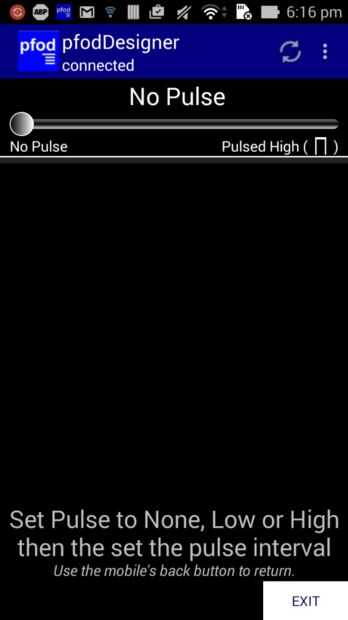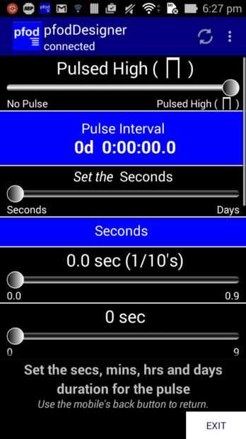Desde esta pantalla puede configurar la salida de pulso alto o bajo o no. Si tu relay es baja activa, entonces mueva el control deslizante medio bajo pulsado, de lo contrario si tu relay es alta activa, luego que desplace el cursor a alta pulsada. En este ejemplo se asume que se utiliza un relé de disparo alta. Así deslizando el cursor a pulsado alta muestra la configuración de duración.