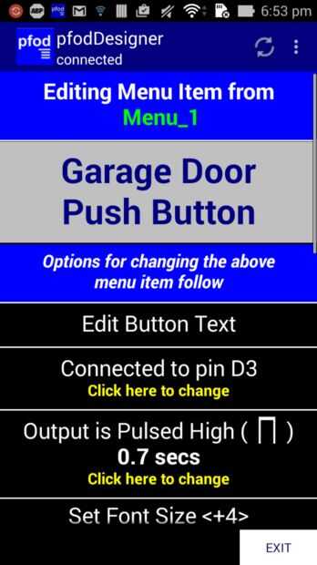 Editar el texto del botón a "Garaje puerta Push Button". Inserte un retorno entre la puerta y empuje. Conjunto la fuente Negrita y fuente a fondo azul y fuente tamaño de fuente y plata para + 4, formato de lo que más le convenga. Conectar este botón con un perno de la entrada-salida de Arduino, decir D3