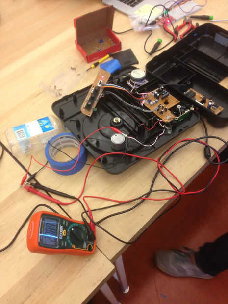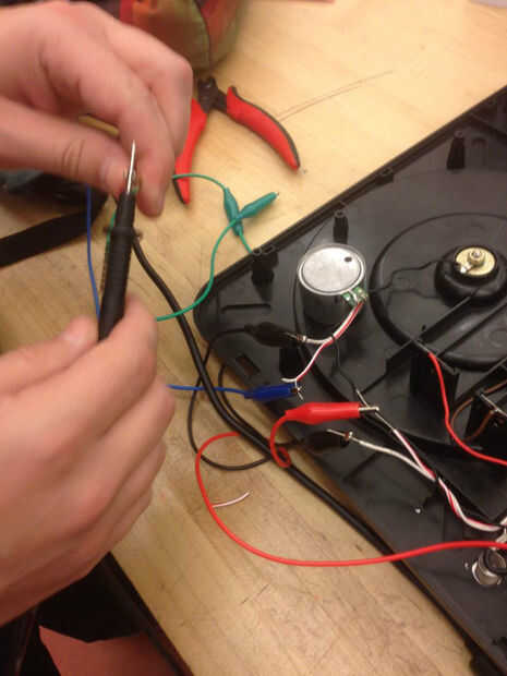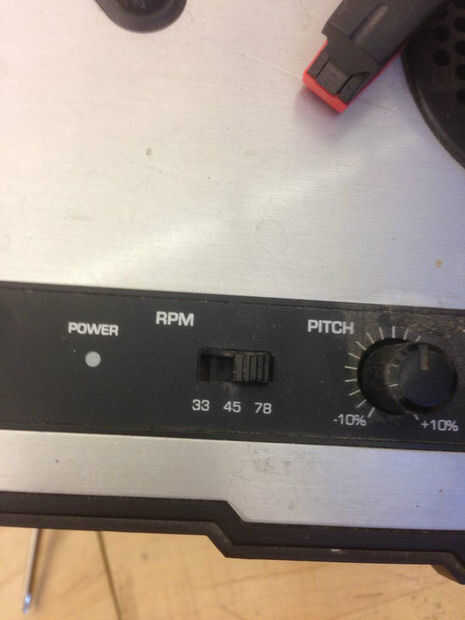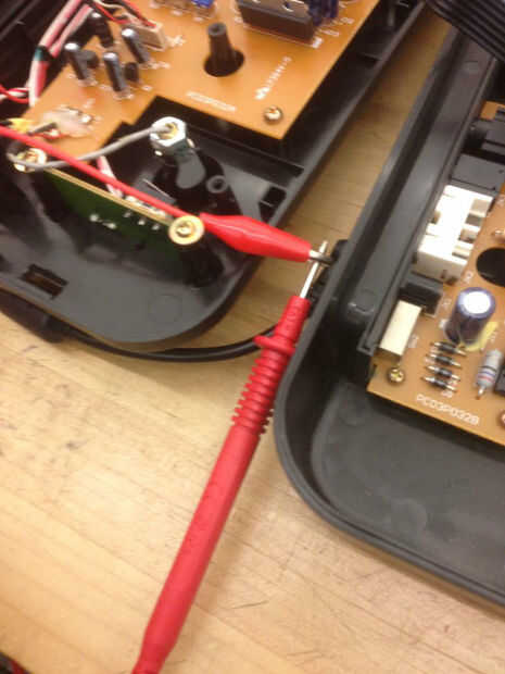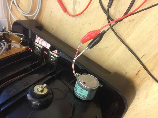 A continuación va estar probando el voltaje para cada ajuste de RPM en el tocadiscos. Establezca el tocadiscos de 78 RPM. Coloque la sonda negra del multímetro en el cable positivo del motor. Coloque la sonda roja del multímetro en el cable positivo en el tocadiscos (es decir, el otro extremo del cable blanco con raya roja). Cocodrilo clips trabajo bien por el momento, ya que voy probando los voltajes de cada velocidad de reproducción. Eventualmente querrá reemplazar los cocodrilos soldando cables más largos en los cables del motor. Mida y registre la caída de tensión. Repita para 45 y 33 RPM.