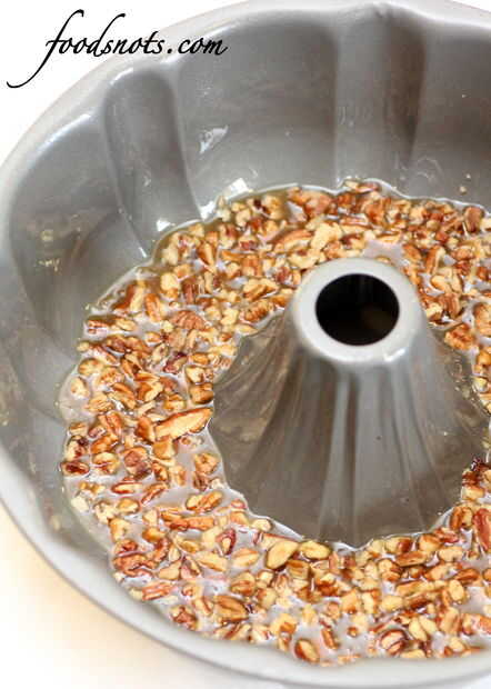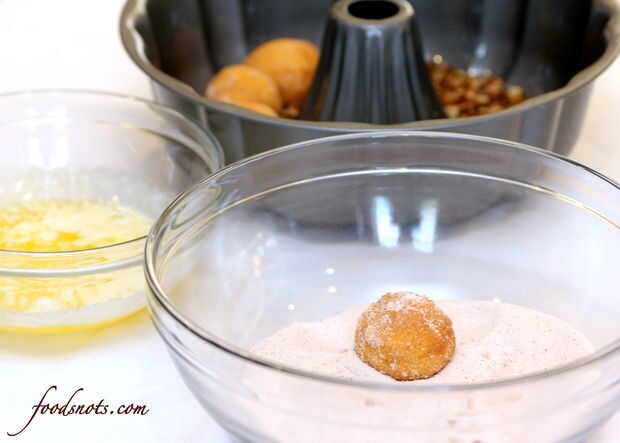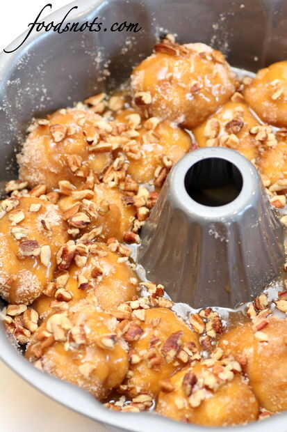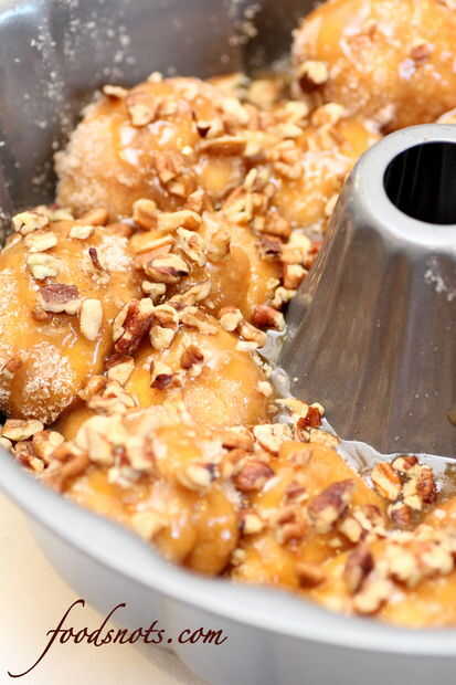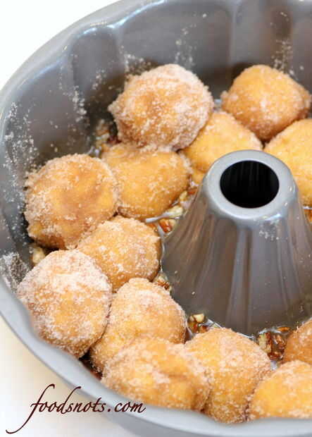 Lugar 20 bolas en el molde sobre el caramelo. Tapa con el restante caramelo y pecanas. Rodillo bolas restantes de mantequilla y el azúcar y colocar sobre las bolas en pan entubado. Deje reposar durante 20 minutos.