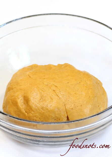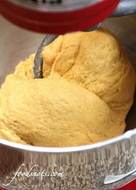 En un bol pequeño, disolver la levadura en agua tibia. Ponga a un lado. En un tazón grande, combine la leche, calabaza, mantequilla, azúcar, sal y pumpkin pie spice. Golpe en los huevos y mezcla de la levadura disuelta. Agregar 2 1/2 tazas de harina y mezclar hasta que justo combinado. Agregar los restantes 2-2 1/2 tazas de harina hasta obtener una masa no pegajosa.
