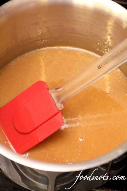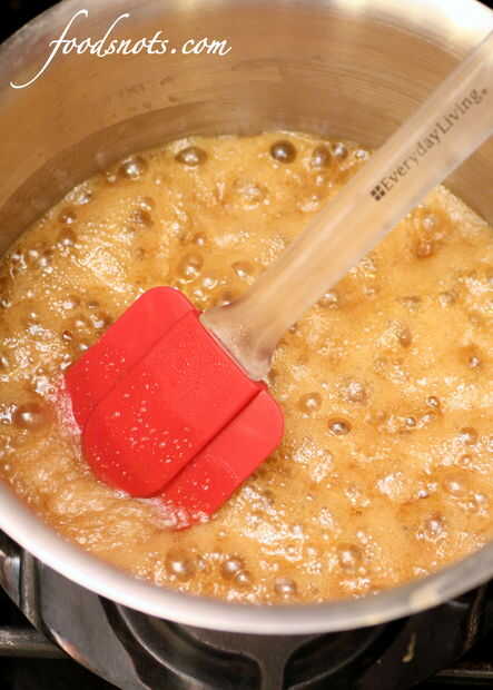 Mientras tanto, hacer caramelo por la combinación de mantequilla, crema de leche, azúcar moreno, jarabe de maíz y vainilla en una cacerola mediana. Poner a hervir sobre fuego medio y cocine, revolviendo continuamente, hasta que el caramelo tiene alcance 210-215 grados F (unos minutos después de hervir). Vierta la mitad del caramelo en un estriado de 10 pulgadas engrasado. Espolvorea la mitad de la nuez sobre el caramelo.
