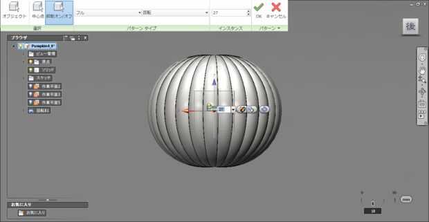 円形状パターンを選択しオブジェクトを環円体に、中心点をZ軸選択して下さい (CADソフト上では「中心点を指定」と書いてあるが、軸を指定して下さい).