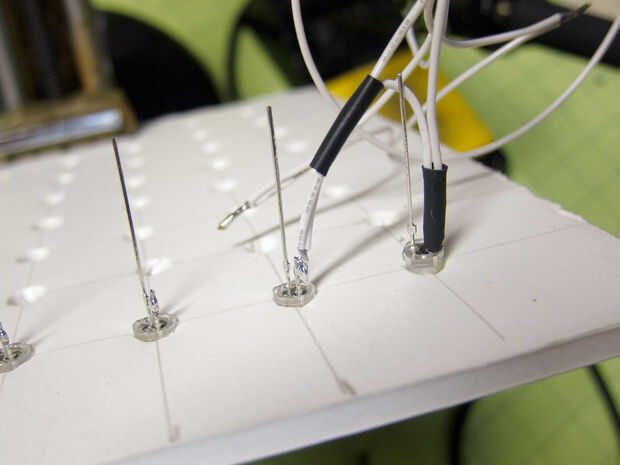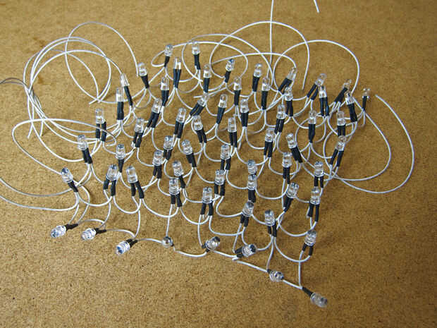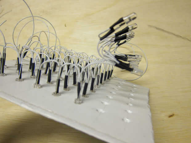 Cuando tienes un conjunto de ocho LEDs todos conectado entre sí, sacar de la plantilla y repetir para siete filas más, asegurándose de hacer todas las conexiones al cable del ánodo de cada LED. Se puede utilizar cualquier fila de la plantilla es más fácil de alcanzar, ya que se trabaja solamente con uno a la vez.