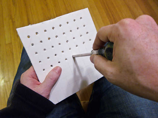 Para conectar los cables con los LEDs necesitas una plantilla para los LEDS. Dibujar una cuadrícula de 8 x 8 con media pulgada de espacio en un pedazo de tablero de núcleo de espuma de 1/4" de espesor, a continuación, utilice un punzón para Hágale un agujero un poco más pequeño en diámetro que el LED en cada intersección. Vas a tener 64 agujeros cuando termines.