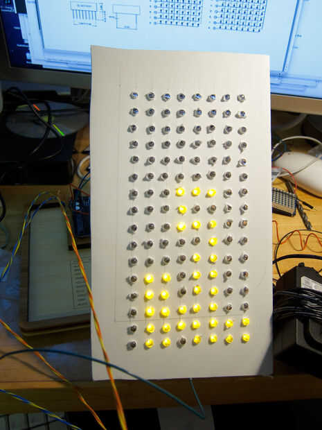 Conecte cada matriz en una mochila y correr a la misma "matrix8x8" programa que hiciste para el mini LED matrices en el paso 4. Si cada uno trabaja, puede cargar el programa de juego. Si no funciona, compruebe que las filas y las columnas de la matriz de LED grande están conectadas a los pines correctos de la mochila. La matriz de LED en la plantilla de espuma que hizo para el montaje de montaje puede hacer más fácil poner a prueba todo el sistema.