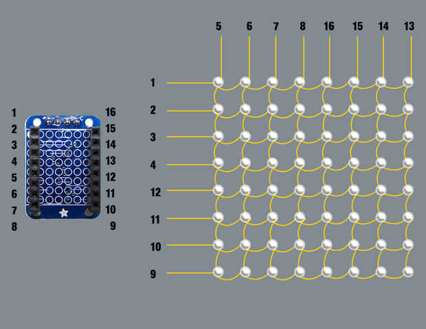 Filas 1-4 conectan a los pines 1-4 en la mochila de la matriz (pines numeración comienza en la parte superior izquierda como buscas en la mochila con las clavijas de alimentación/tierra/datos/reloj 4 pines en la parte superior). Columnas 1-4 conectan a los pines 5-8. La numeración de los pines se envuelve alrededor para el pin 9 es en la parte inferior derecha. Filas 5-8 conectan a pines 12-9, y columnas 5-8 conectan a los pines 16-13. Consulte el diagrama para más claridad.