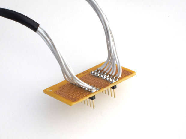Podría conectar cada cable en los encabezados en la mochila de matriz individualmente, pero probablemente harás un montón de enchufar y desenchufar, por lo podría llegar a ser una real molestia. En cambio usted quiere soldar cada cable en una tira de jefe varón y conecte en la mochila de la matriz. Montara las tiras de encabezado en un trozo de placa de prototipos para poder enchufe y desenchufe todos los 16 pines juntos.