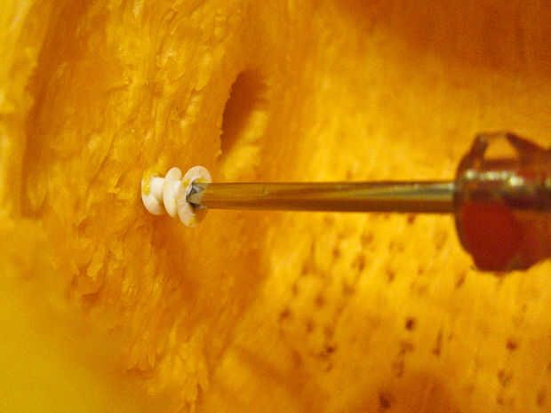 Retire la palanca de mando. Con el cortador de alambre, corte las puntas de expansión de los tarugos para que estén más cortos que el espesor de la piel de la calabaza. Tornillo estas acortado, apodó tarugos en los orificios piloto hiciste.