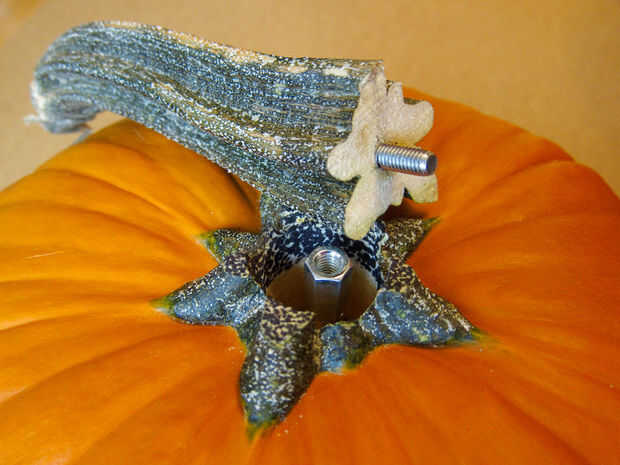Encontrar el centro del tallo y perfore un agujero de 13/64"(del mismo tamaño utilizado para los agujeros de LED, coincidentemente) alrededor de una pulgada en el tallo. Esto sería un buen paso para probar en la calabaza de la práctica, para asegurarse de que los tornillos tornillo firmemente en el agujero.