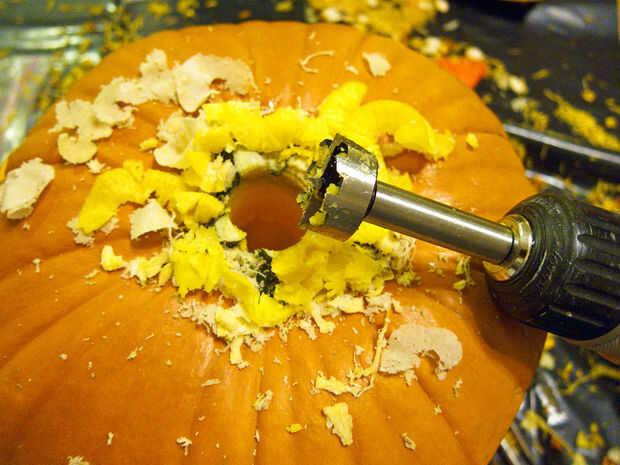 Taladre un orificio de 1-1/8" directamente a través de la base del tallo y en la calabaza.