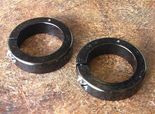 Así que los rizos se se exprimen juntas entre el lock-ons. Esto les mantendrá en el lugar correcto, pero también necesitamos una forma para evitar los rizos roten en las barras. Para ello podemos ejecutar una sección de radios de bicicleta a través de los rizos y en algunos agujeros recién hechos en las lock-ons.